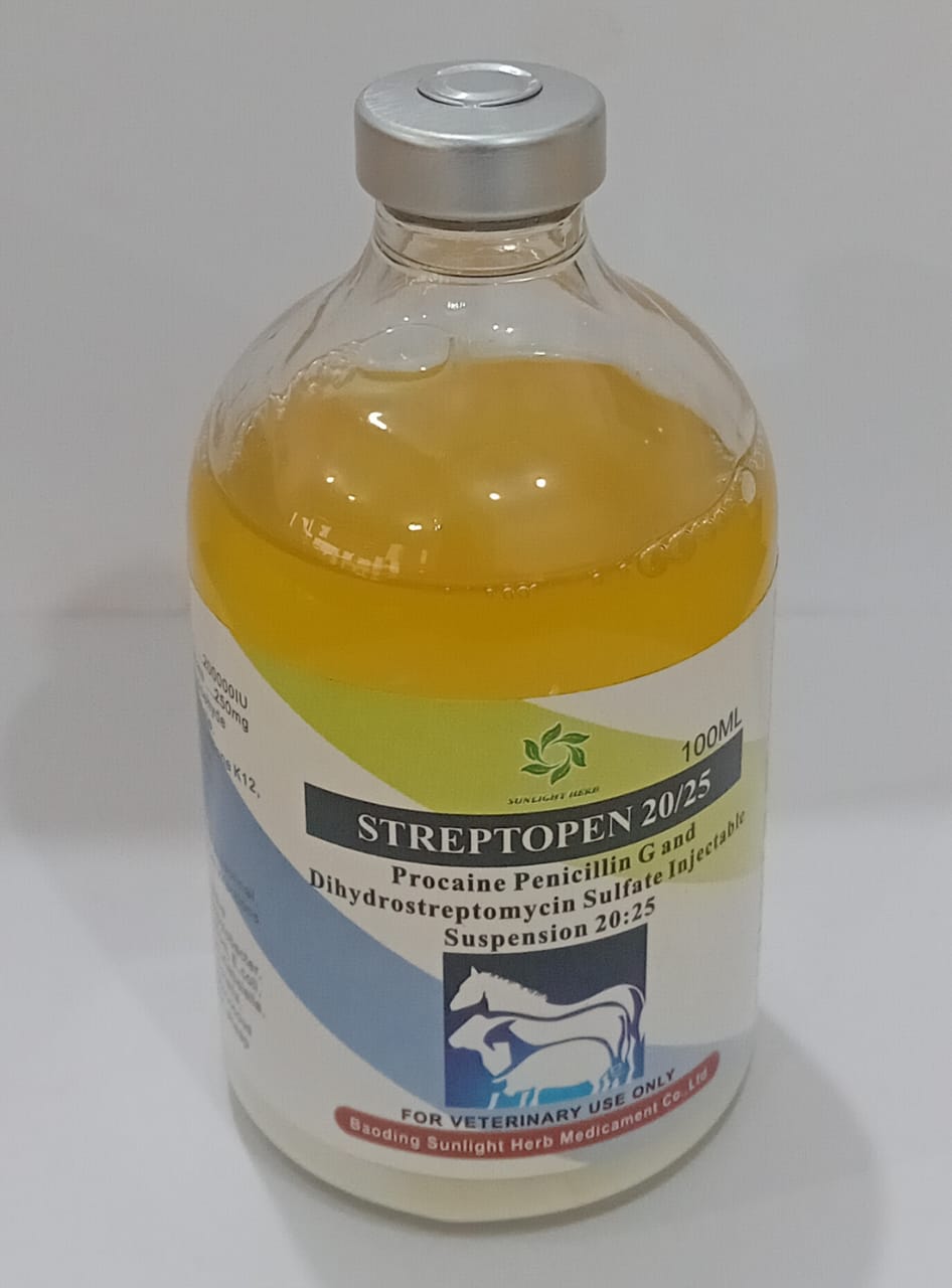 PENSTREP (STREPTOPEN 20/25) is a veterinary antibiotic injection that combines Procaine Penicillin G (200,000 IU) and Dihydrostreptomycin Sulfate (250 mg) in a 100 mL suspension.